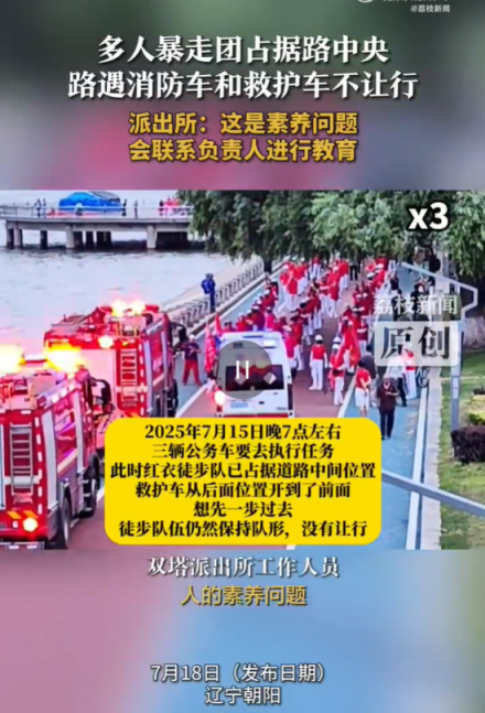 7月17日,辽宁向阳一暴走团与消防车、救护车“对持”的视频,激发庸碌良善。视频自大,一组衣着一致、队形整王人的暴走团,与本质任务的消防车、救护车“狭路相逢”。由于暴走团占据路中央长久不让说念,消防车和救护车不得已靠边停驻,等暴走团与车辆错开后才不绝通行。7月18日,当地派出所回复称,这是教唆问题,会有关暴走团厚爱东说念主进行品评教会。